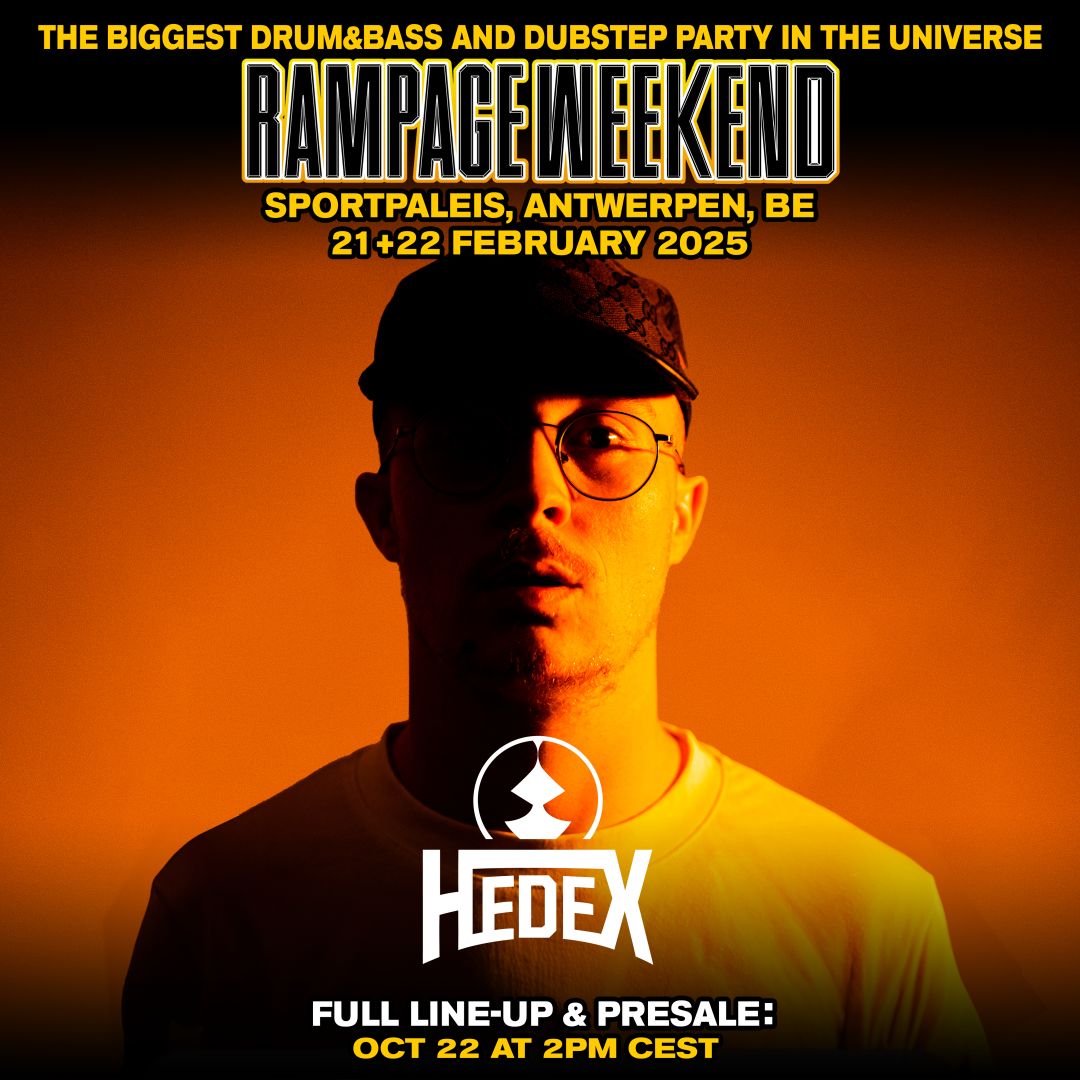 THE DRUM AND BASS MASTERMIND HEDEX WILL HAIL DOWN ON SATURDAY THE 22ND OF FEBRUARY TO JOIN US AT THE SPORTPALEIS FOR RAMPAGE WEEKEND 2025! FULL LINE-UP & TICKET SALE GO LIVE ON OCTOBER 22ND AT 2PM CEST.